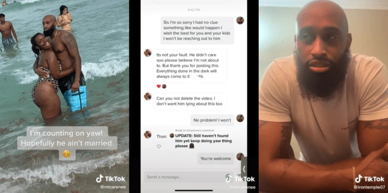 Chàng trai mà Mica tìm kiếm thực chất đã có vợ. Bức giữa là đoạn chat giữa Mica và cô vợ. Ảnh: TIKTOK