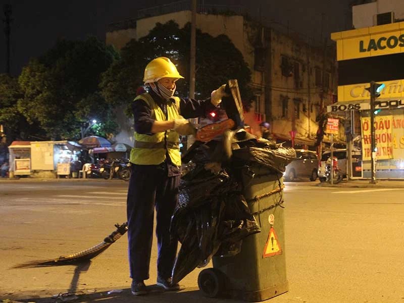Những công nhân vệ sinh vẫn âm thầm, lặng lẽ hằng đêm làm sạch cho TP. Ảnh: HOÀNG GIANG