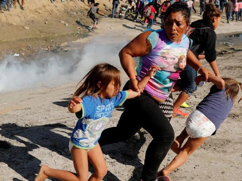 Người mẹ Maria Mesa và hai con nhỏ chạy tránh hơi cay do lực lượng biên phòng Mỹ bắn ra ở khu vực biên giới TP Tijuana (Mexico) và TP San Diego (Mỹ). Ảnh: CNN
