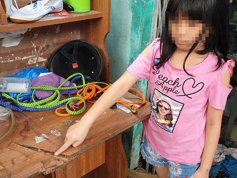 Cháu Phạm Thị Thanh T. (con gái chị Hoa, anh Tuyền) chỉ vào vết chém nhóm Ánh “nhì” để lại trên bàn học của cháu. Ảnh: ĐỖ HOÀNG