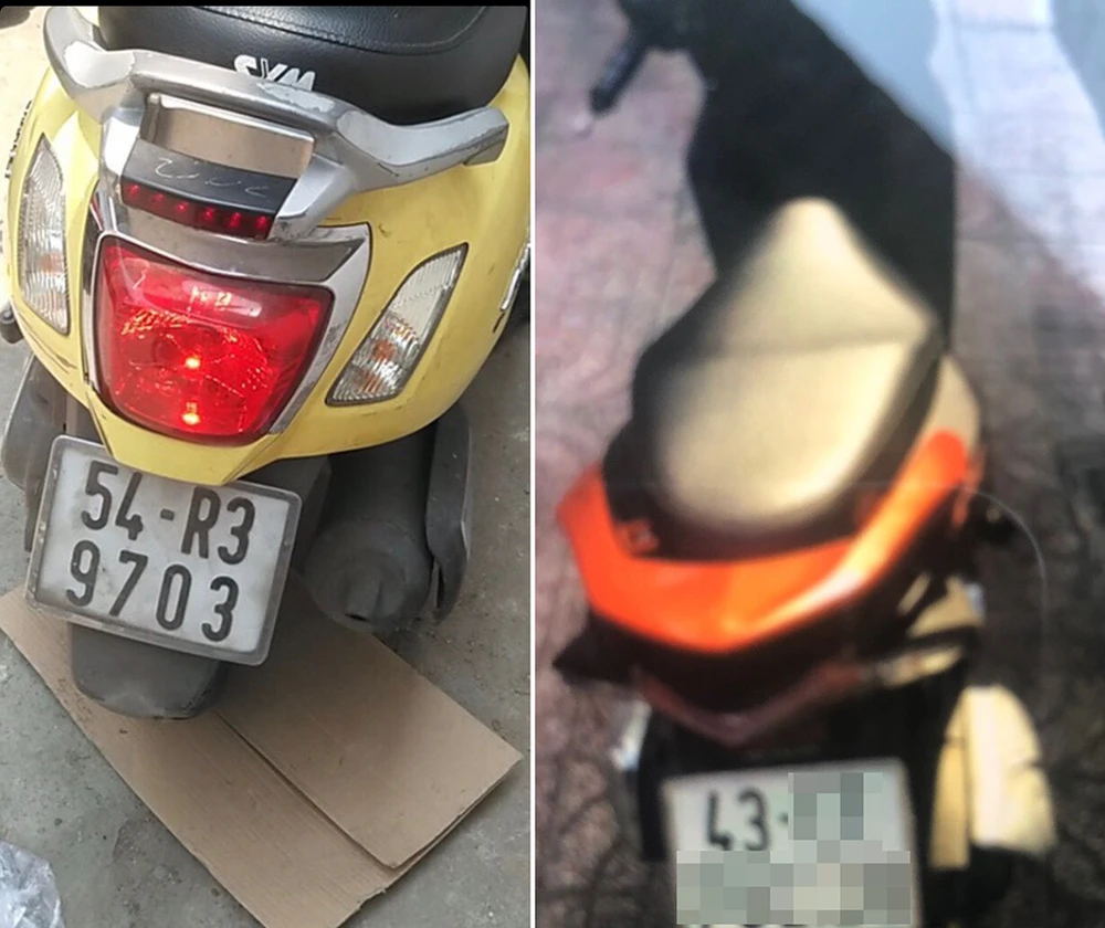 Chiếc xe máy mà hai tên cướp sử dụng (bên phải) và xe máy của nạn nhân. Ảnh: CA