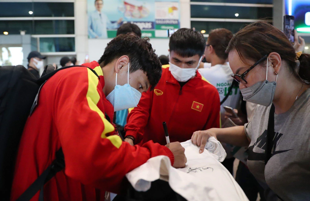 Hàng trăm CĐV đã có mặt tại sân bay để xin chụp hình và xin chữ ký. Nhiều người còn mang theo gấu bông, đồ ăn để tặng thần tượng. Tại sân bay, đại diện của LBBĐ Việt Nam (VFF) đã đón, trao tặng hoa chúc mừng toàn đội.
