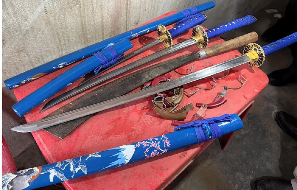 Hung khí công an khám xét thu giữ. Ảnh: VŨ HỘI.