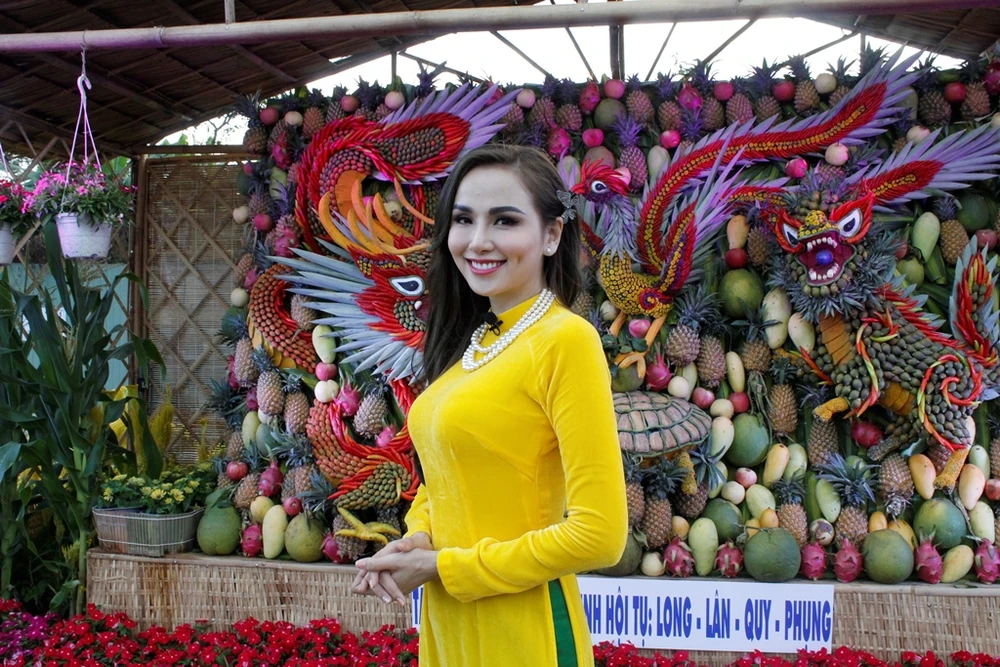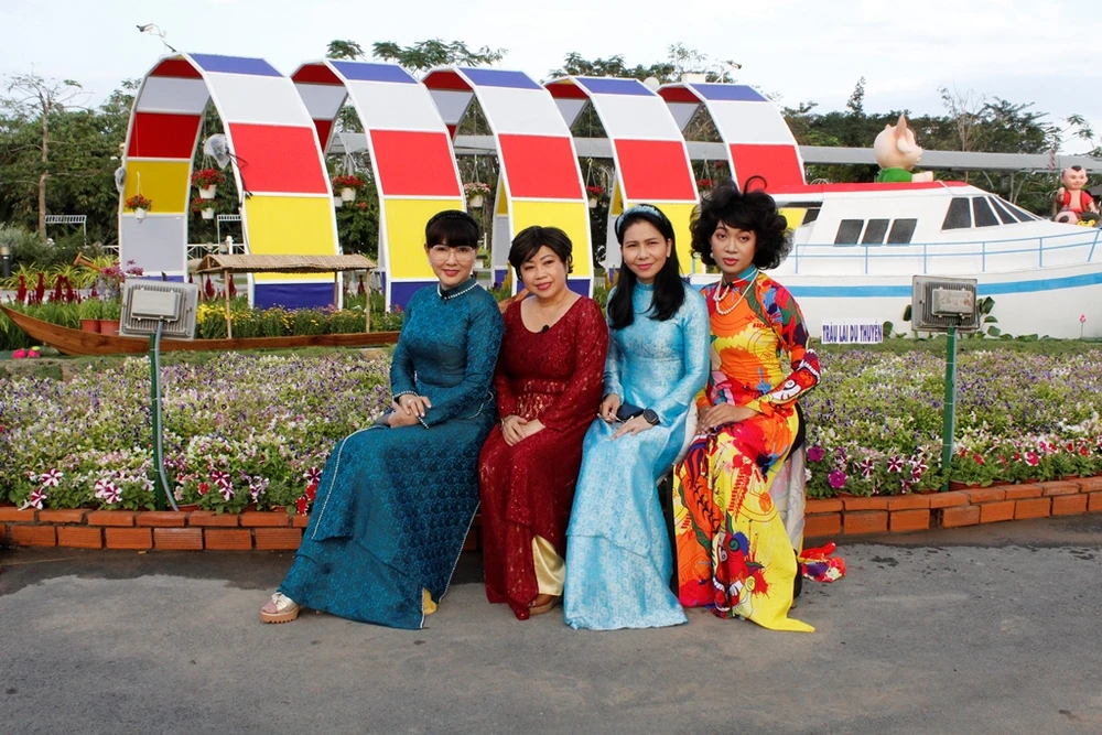Hoa hậu thế giới người Việt Diễm Hương cùng nhóm nghệ sĩ TP.HCM là những người check-in sớm ở đường hoa Cần Thơ trước giờ khai mạc. Ảnh: NHẪN NAM