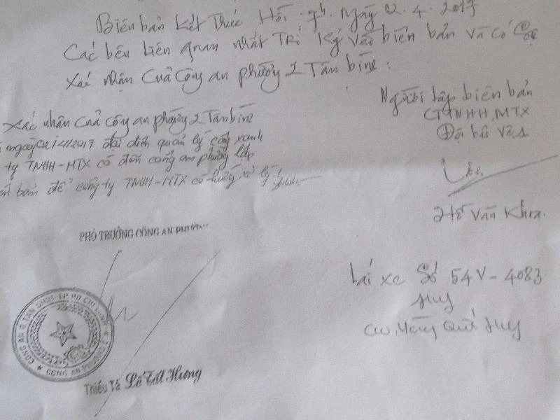 Biên bản của công an phường 2, quận Tân Bình xác nhận sự việc cắt chui cây xanh trên đường Trường Sơn