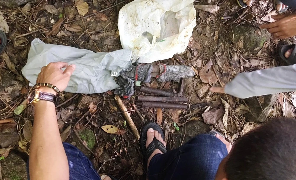 Dụng cụ đi trộm được nhóm nghi phạm giấu trong hang đá trên đèo Hải Vân. Ảnh: CA