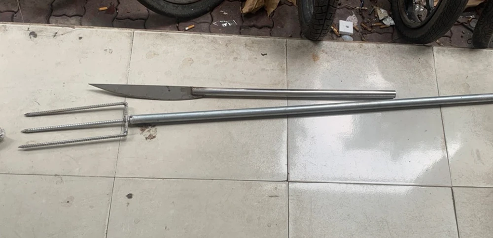 Công an thu giữ tang vật gồm ba chĩa, dao phóng lợn trong vụ việc. Ảnh: CA