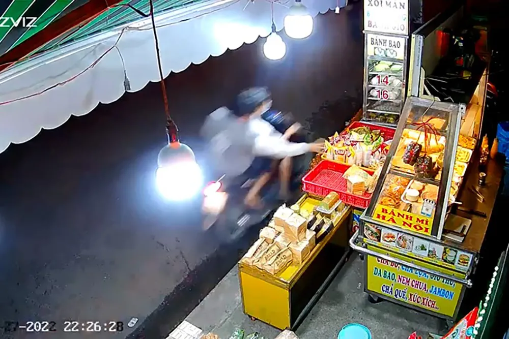 Hai thanh thiếu niên giật cơm cháy chà bông bị camera an ninh ghi lại. Ảnh chụp từ clip