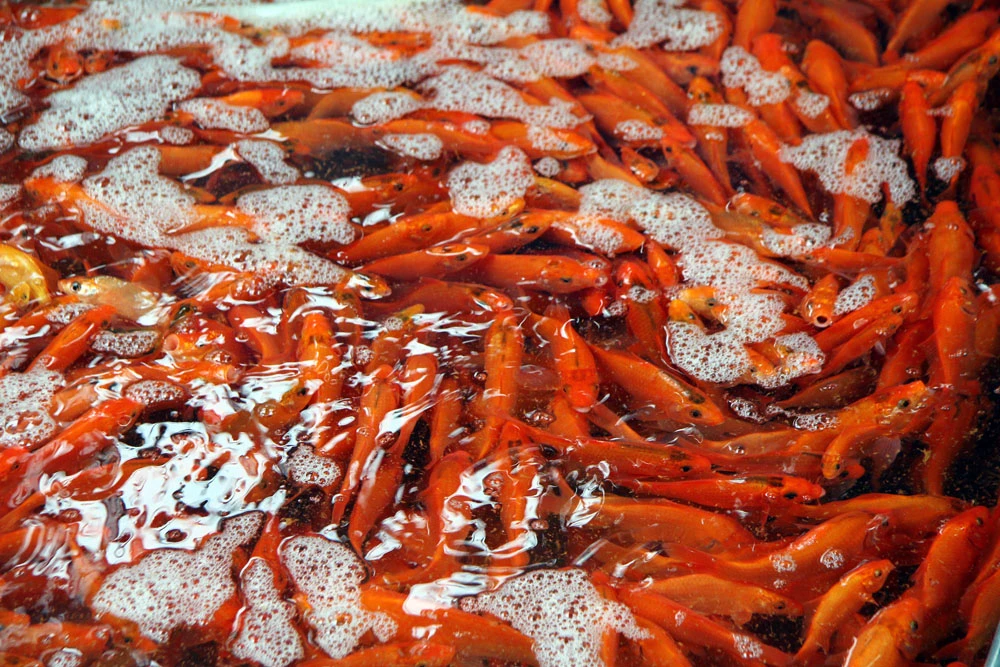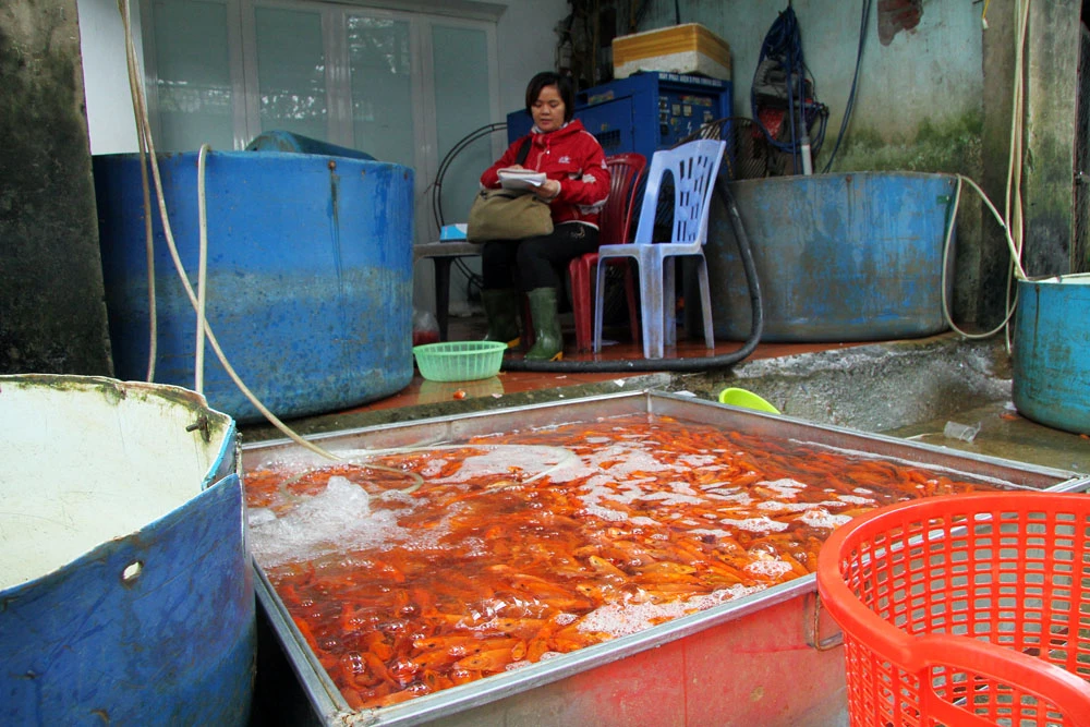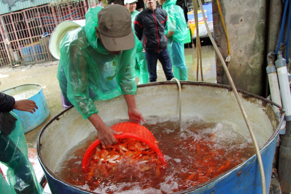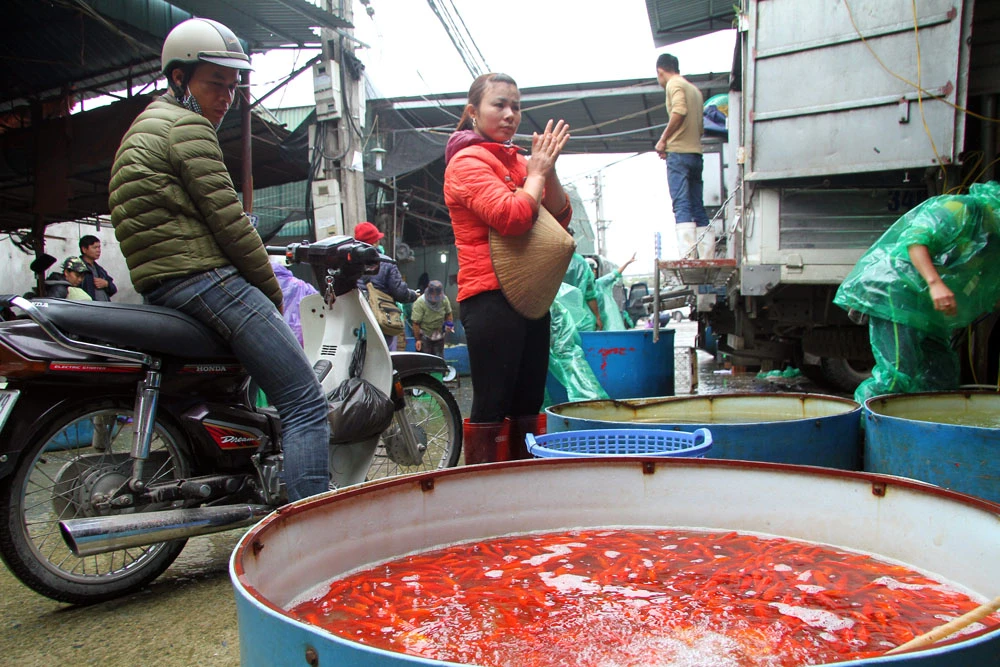 Hàng chục tấn cá vàng từ khắp các tỉnh như Nam Định, Hải Dương,… đổ về đây để phục vụ người dân Hà Nội mua về làm lễ.