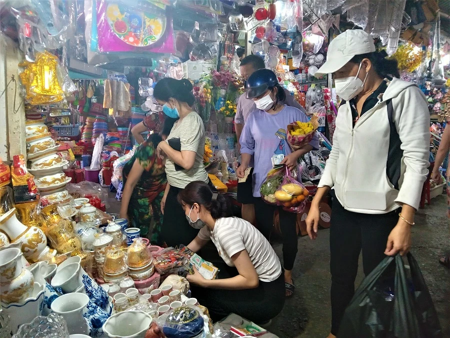 Khoảng 9 giờ sáng tại sạp đồ thờ cúng bà Tâm- chợ Nguyễn Văn Trỗi tấp nập khách. Bên cạnh mua bộ đồ cúng ông Táo, người dân chủ yếu mua các bộ đồ cúng đưa rước ông bà, cúng giao thừa, cúng mùng 3…