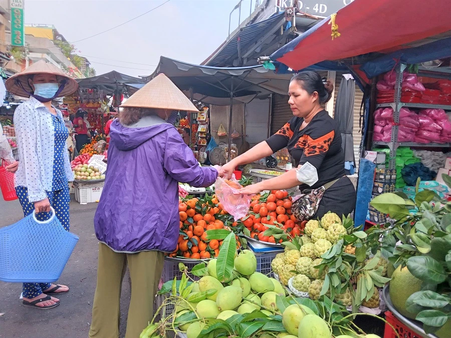 Sáng 24-1, nhằm 22 tháng Chạp, ghi nhận tại một số chợ trên địa bàn TP.HCM như Hoàng Hoa Thám, Trần Hữu Trang, Nguyễn Văn Trỗi...cho thấy hoạt động mua bán nhộn nhịp nhất là các sạp bán bông, đồ thờ cúng, sạp trái cây.