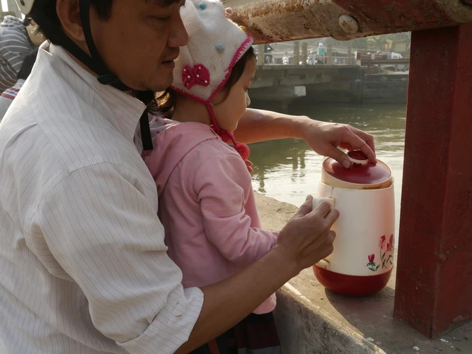 Không khí náo nhiệt, người ra người vào tấp nập xung quanh khắp hai bên bờ cầu Nam Lý. Đây là địa điểm lý tưởng để người dân thả cá chép.