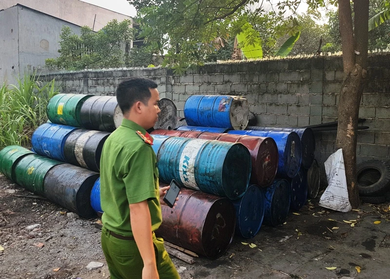Cảnh sát môi trường (C49) đang xác minh nguồn gốc số nhớt thải được tập kết về một cơ sở tái chế trái phép ở huyện Hóc Môn, TP.HCM.