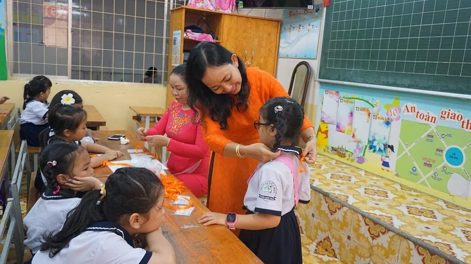Học sinh lớp 1 Trường Tiểu học Trần Quốc Thảo, quận 3 được giáo viên ân cần đeo bảng tên. Ảnh: NGUYỄN QUYÊN