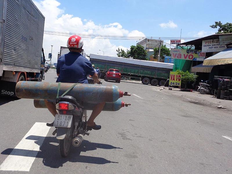 Theo quy định hiện hành (Điều 55 Nghị định 87/2018), mỗi xe máy chỉ được phép chở một bình gas có dung tích dưới 50 lít. Đối với mô tô, xe máy vận chuyển chở gas “phải có giá đỡ chắc chắn, chai phải luôn ở vị trí thẳng đứng, van chai hướng lên trên”.