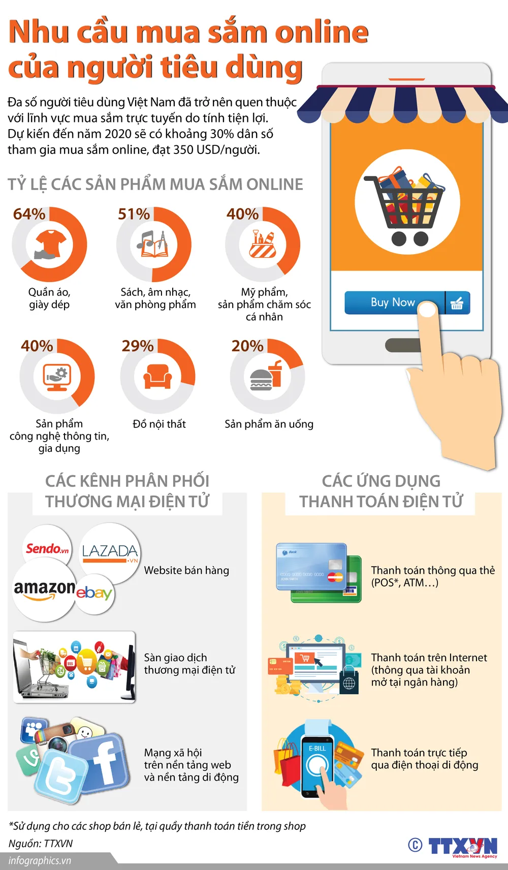 Đa số người tiêu dùng Việt Nam đã trở nên quen thuộc với lĩnh vực mua sắm trực tuyến do tính tiện lợi. Dự kiến đến năm 2020 sẽ có khoảng 30% dân số tham gia mua sắm online, đạt 350 USD/người.