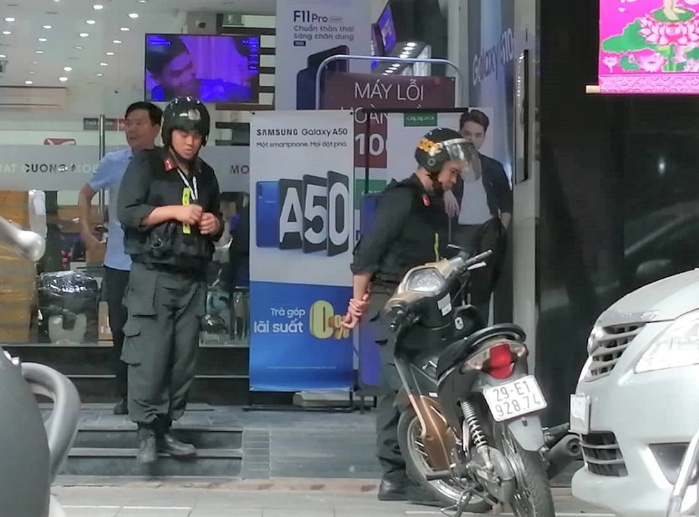 Công an khám xét chuỗi cửa hàng của Nhật Cường Mobile. Ảnh: TP
