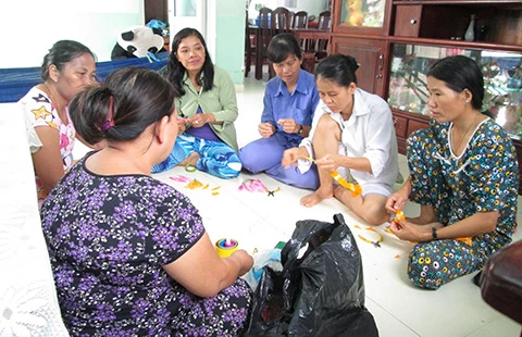 Các mẹ làm hoa vải để các con tặng cô giáo. Ảnh: PN