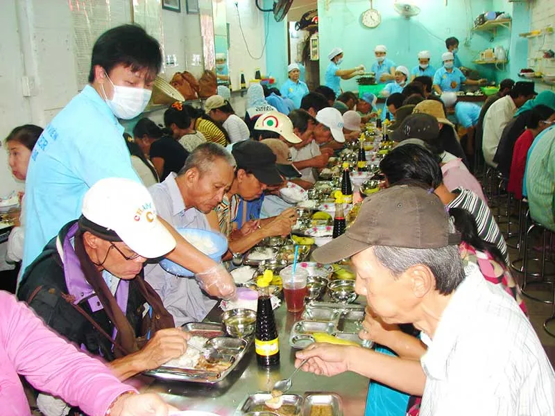 Quán mở rồi, thỉnh thoảng tôi ghé qua. Mới rửa vài cái khay ăn cơm bằng inox, tôi đã rụng rời tay chân vì mỏi. Vậy mà đội ngũ tình nguyện viên làm miệt mài từ ngày này qua ngày khác. Có hôm tôi thấy một em bé mới học lớp 6 cũng được mẹ chở tới. Tuổi nhỏ làm việc nhỏ, em bé được giao công việc lau bàn. Bé làm việc hết sức nghiêm chỉnh. Mấy cậu ấm cô chiêu du học, làm việc ở nước ngoài lâu lâu về thăm nhà cũng nhào vô làm hay góp tiền ủng hộ. Thỉnh thoảng vài nghệ sĩ tên tuổi âm thầm đến đây phụ giúp, đóng góp.
