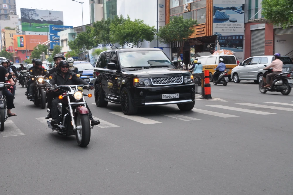 Đoàn mô tô dẫn đường bảo vệ đoàn xe của Beckham lưu thông trên đường phố.