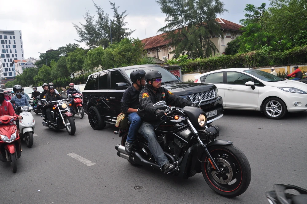 Người vệ sĩ riêng to cao hơn 2 mét, luôn sát cánh cùng Beckham ở nhiều nơi, đã phải toát mồ hôi hột trước cảnh chỉ có ở Việt Nam với rất đông người hâm mộ cưỡi mô tô, xe gắn máy đuổi theo ào ào phía sau.