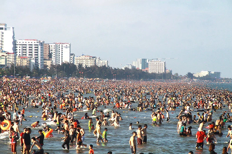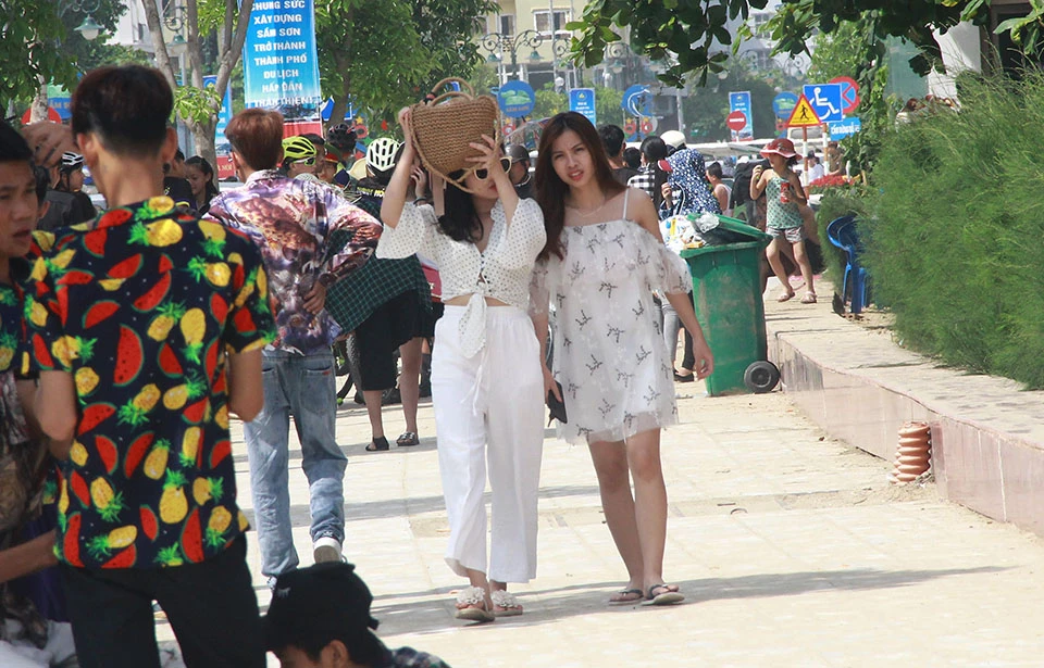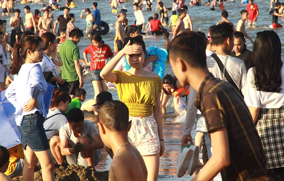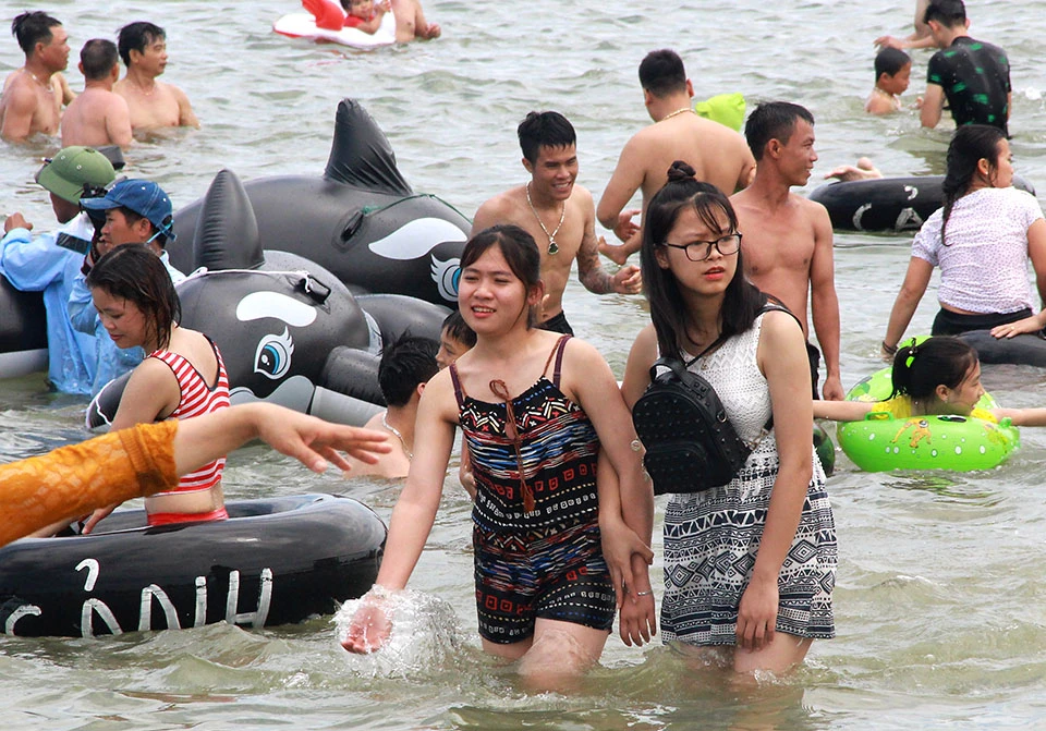 Năm nay lượng người đổ về Sầm Sơn vẫn ít hơn so với năm trước nhưng nhiều người cho biết họ vẫn phải chen chúc khi tắm biển hay dạo bộ.