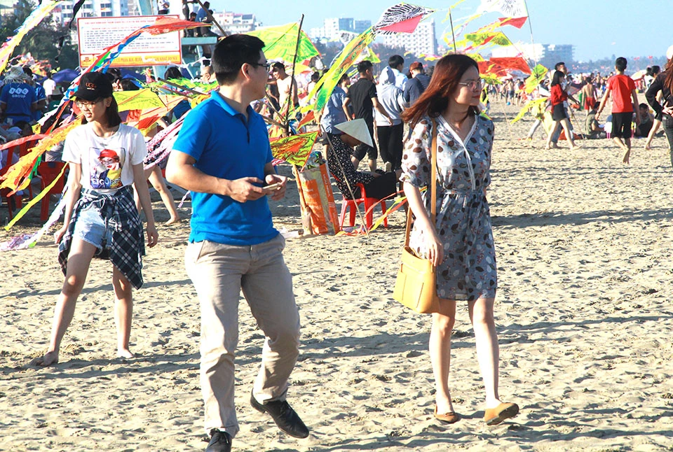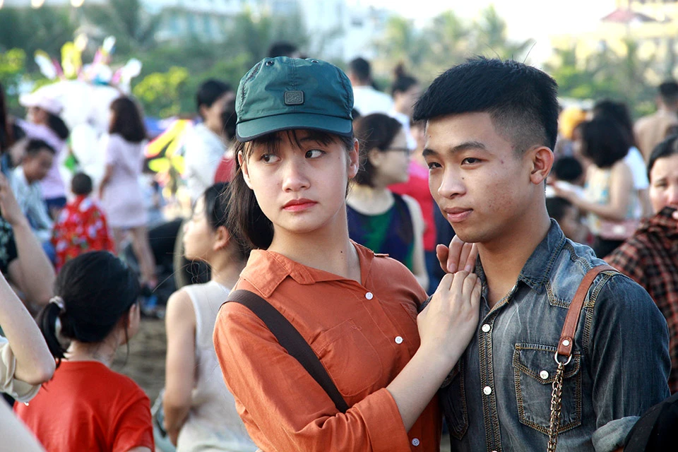 Đôi bạn trẻ tạo dáng để người thân ghi lại khoảnh khắc bên bờ biển Sầm Sơn.