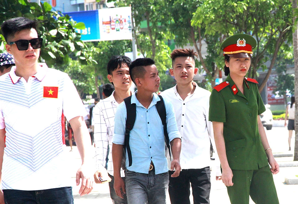 Giữa cái nóng 35 độ C, nữ cảnh sát xinh đẹp vẫn luôn tập trung cao độ bảo đảm an toàn cho du khách.