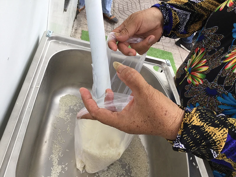 Nhiều người mua gạo mang đến góp vào máy phát gạo.