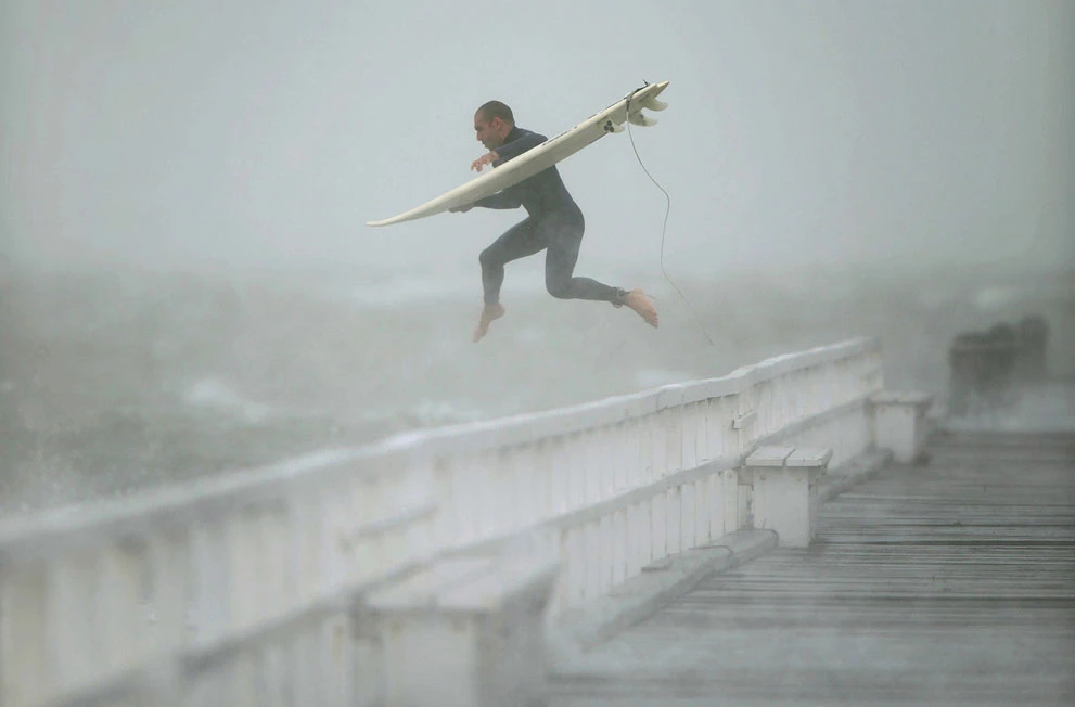 Một người lướt ván nhảy ra khỏi bến tàu Vịnh Port Phillip để tận dụng lợi thế của những con sóng gần khu vực Melbourne vào ngày 24-6-2014.