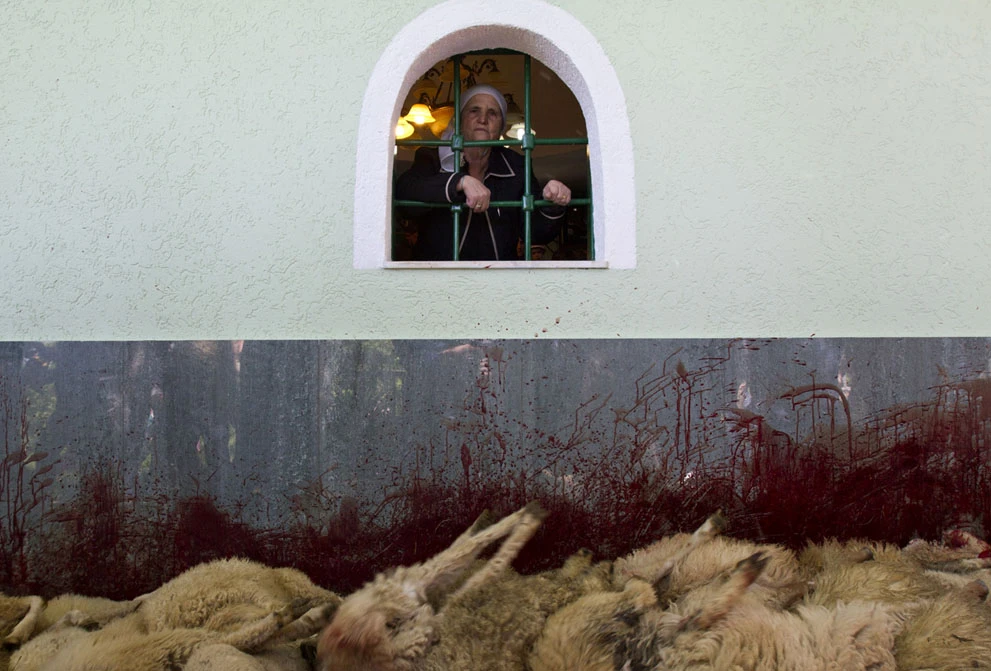 Một người phụ nữ nhìn ra ngoài cửa sổ nơi mà hàng loạt con cừu bị giết hại trong ngày lễ Saint George's ở làng Babaj i Bokes, Tây Kosovo, ngày 6-5-2014.