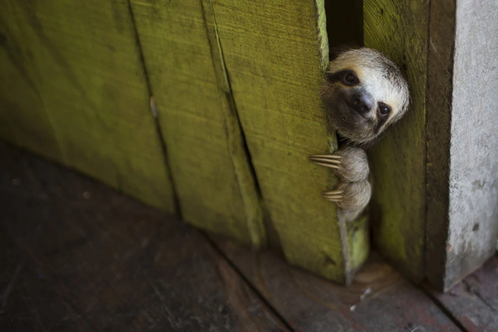 Một chú Lười nép sau cánh cửa một gia đình ở làng