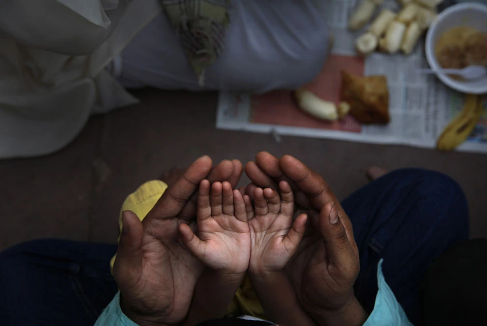 Một người Ấn Độ Hồi giáo giữ bàn tay của cô con gái mình trong lòng ban tay anh ta để cầu nguyện trong ngày lễ Ramadan, tại nhà thờ Hồi giáo Jama ở New Delhi, Ấn Độ.
