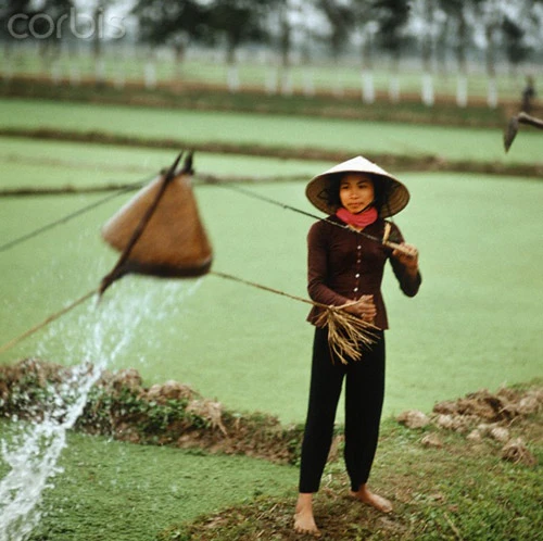 Một phụ nữ miền Bắc đầu đội nón lá đang tát nước từ mương vào ruộng. Ảnh chụp tại tỉnh Nam Hà (cũ). Ảnh:Werner Schulze/dpa/Corbis