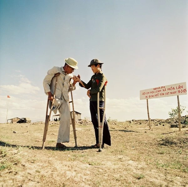Một thanh niên xung phong châm thuốc cho một người lớn tuổi trên nghĩa địa. Ảnh: Thomas Billhardt