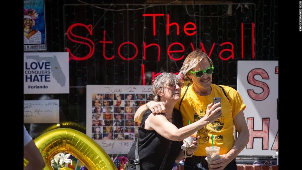 Hai người tại New York selfie trước Stonewall Inn, một biểu tượng của phong trào vận động vì quyền của người đồng tính. Vài ngày sau nơi đây được chọn là công trình quốc gia đầu tiên để ghi dấu các phong trào vận động về quyền của cộng đồng LGBT tại Mỹ.