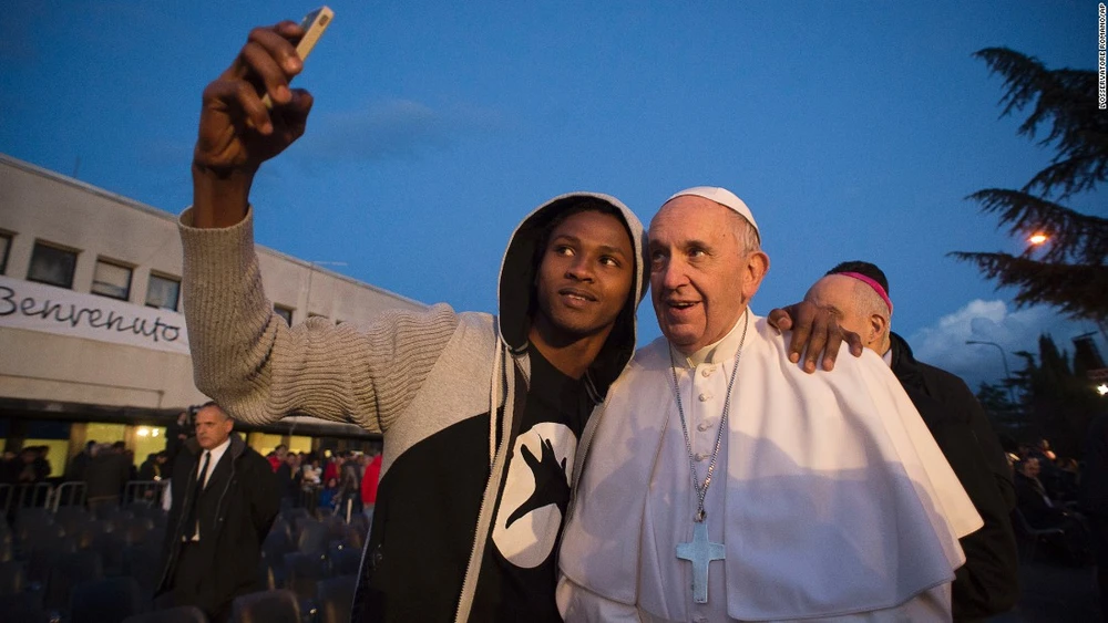 Giáo hoàng Francis chụp ảnh với một người di cư trong chuyến thăm của mình tới trại tị nạn ở Rome, Italy vào hôm 24-3.