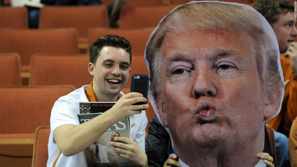 Một cổ động viên bóng rổ tại Trường ĐH Texas selfie cùng bức ảnh của Donald Trump trước trận đấu hôm 12-1.