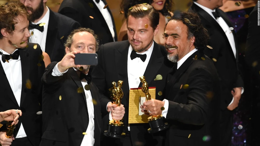 Nhà quay phim Emmanuel Lubezki, diễn viên Leonardo DiCaprio và đạo diễn Alejandro G. Iñárritu selfie trong lễ trao giải Oscar vào hôm 28-2. Cả ba người cùng đoạt giải Oscar cho các đề cử khác nhau trong bộ phim The Revenant.