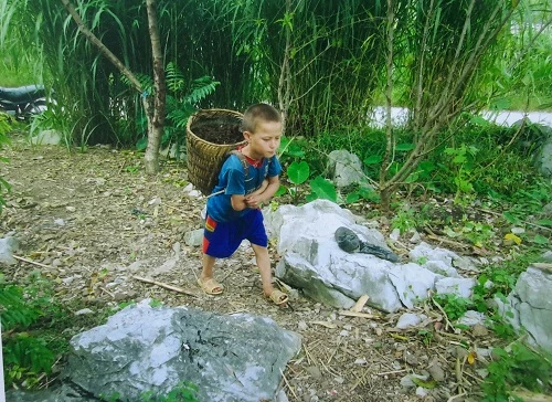 Em Giàng Thị Dính năm nay 13 tuổi chụp em trai mình đang địu phân đi trồng đậu. Cậu em chín tuổi của Dính đã quen với công việc này từ nhỏ. Một cậu em khác của Dính đã biết cày nương từ năm 10 tuổi.
