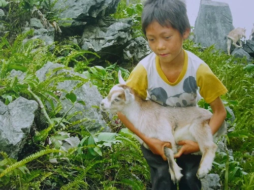 Trong một bức ảnh khác, tác giả Vừ Thị Súng chụp ảnh em trai mình là Vừ Mí Dình đang bế con dê con lên vách đá để theo mẹ. Súng kể, em trai mình sau giờ học phải thả bốn con dê ở nhà đi ăn cỏ. Đó cũng là tài sản giúp cha Dính bán lấy tiền mua vở, mua quần áo cho em đi học: “Em còn nhỏ nhưng đã phải đi làm vất vả, cuộc sống của bọn em rất vất vả, toàn đá là đá chỉ trồng được mỗi ngô thôi” - Súng nói bên cạnh bức ảnh của mình.