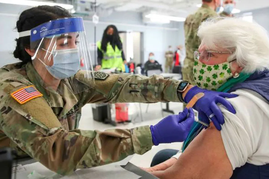 Một cụ bà sống tại bang Illinois (Mỹ) đang được tiêm vaccine ngừa COVID-19. Ảnh: AFP