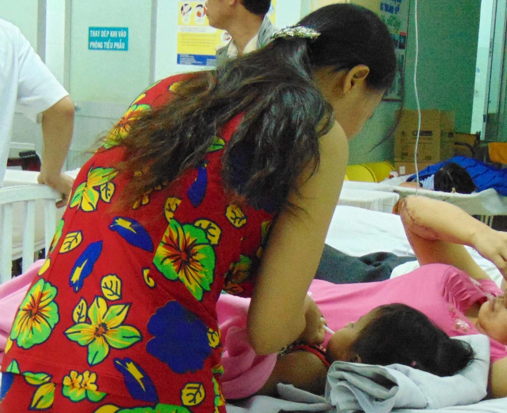 Mẹ và con cùng nằm giường cấp cứu trong vụ tai nạn khiến gia đình ba người bị thương. Ảnh: TRẦN NGỌC
