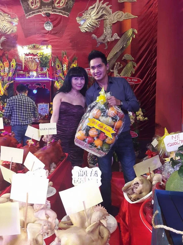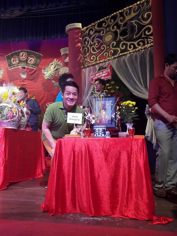 Anh Vũ, Trịnh Kim Chi diện vàng rực rỡ đi cúng Tổ tại sân khấu Phú Nhuận.