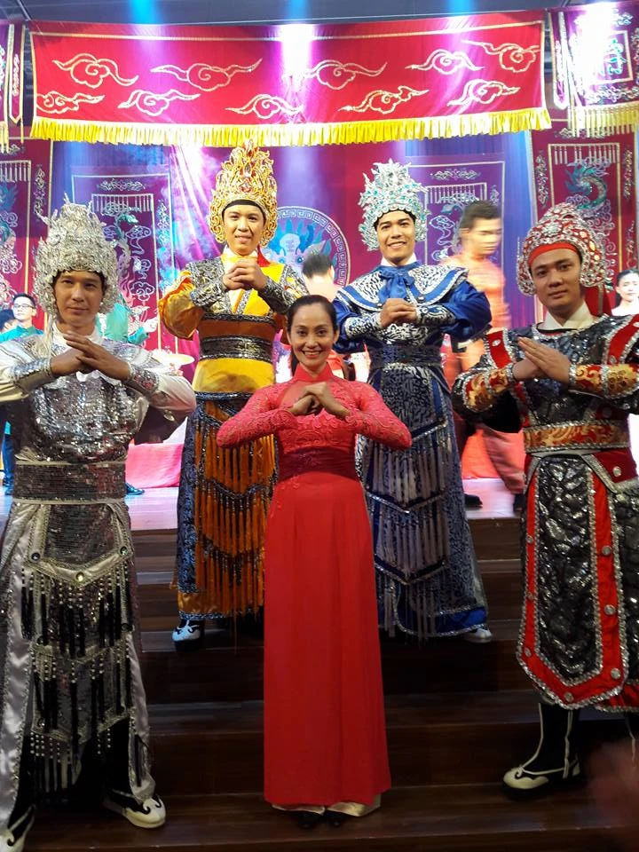 Sân khấu TKC của bà bầu Trịnh Kim Chi cũng tổ chức lễ trọng thể với nhiều nghệ sĩ trẻ mặc trang phục cổ. Nghệ sĩ Hạnh Thúy chụp ảnh cùng các nghệ sĩ trẻ.