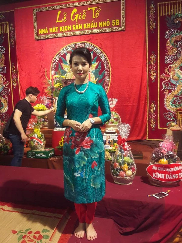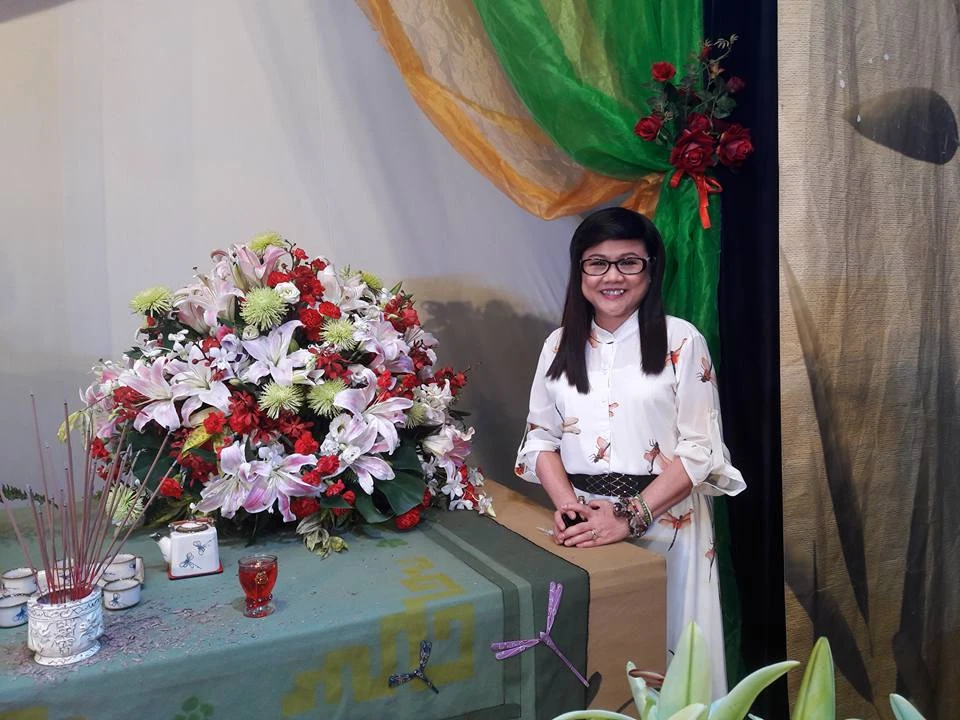 Nghệ sĩ Ái Như bên giỏ hoa tươi dâng tổ.