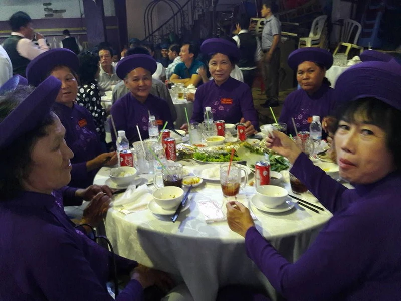Các nữ bô lão cũng áo dài khăn đóng chỉnh tề dự giỗ tổ hát bội.