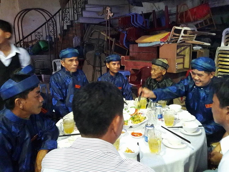 Những vị khách bô lão áo dài khăn đóng từ các đình miễu là khách mời chỉ có ở giỗ tổ tại Đoàn Hát bội.