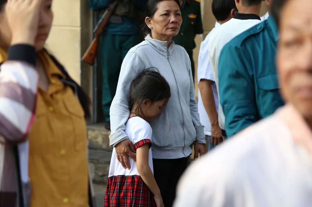 Em nhỏ buồn thiu nép sát vào người mẹ trong ngày tiễn anh lên đường nhập ngũ.