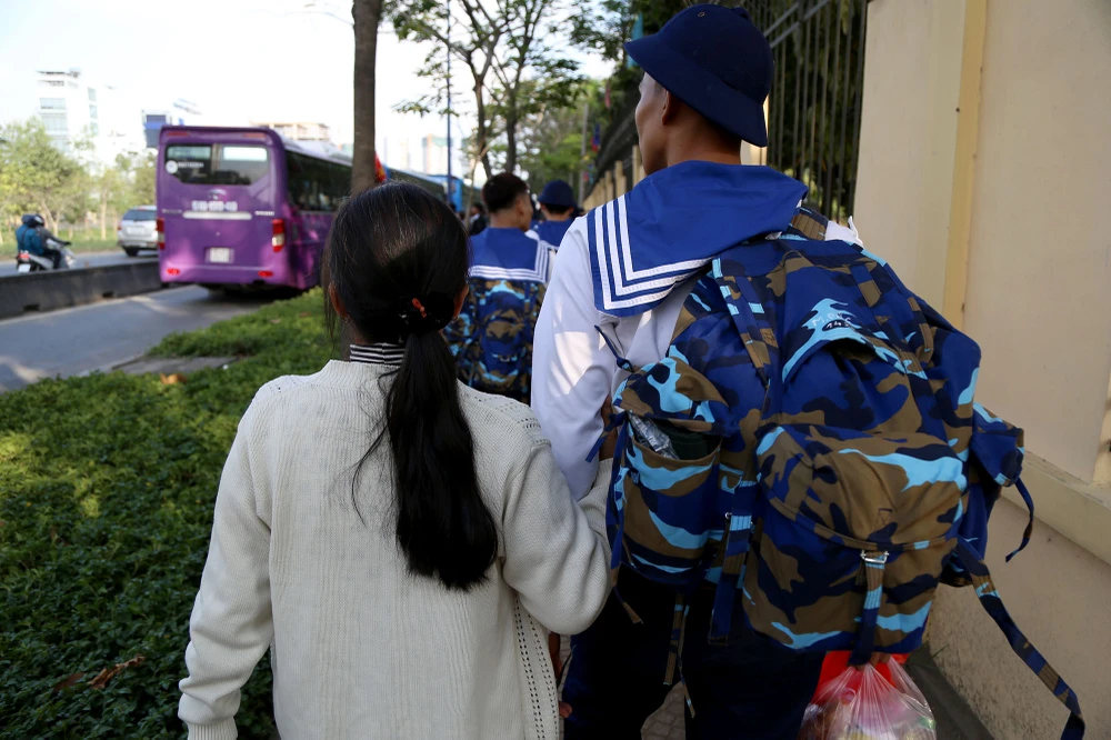Người mẹ nắm chặt tay con trai và tiễn con một đoạn trước khi vào quân ngũ.